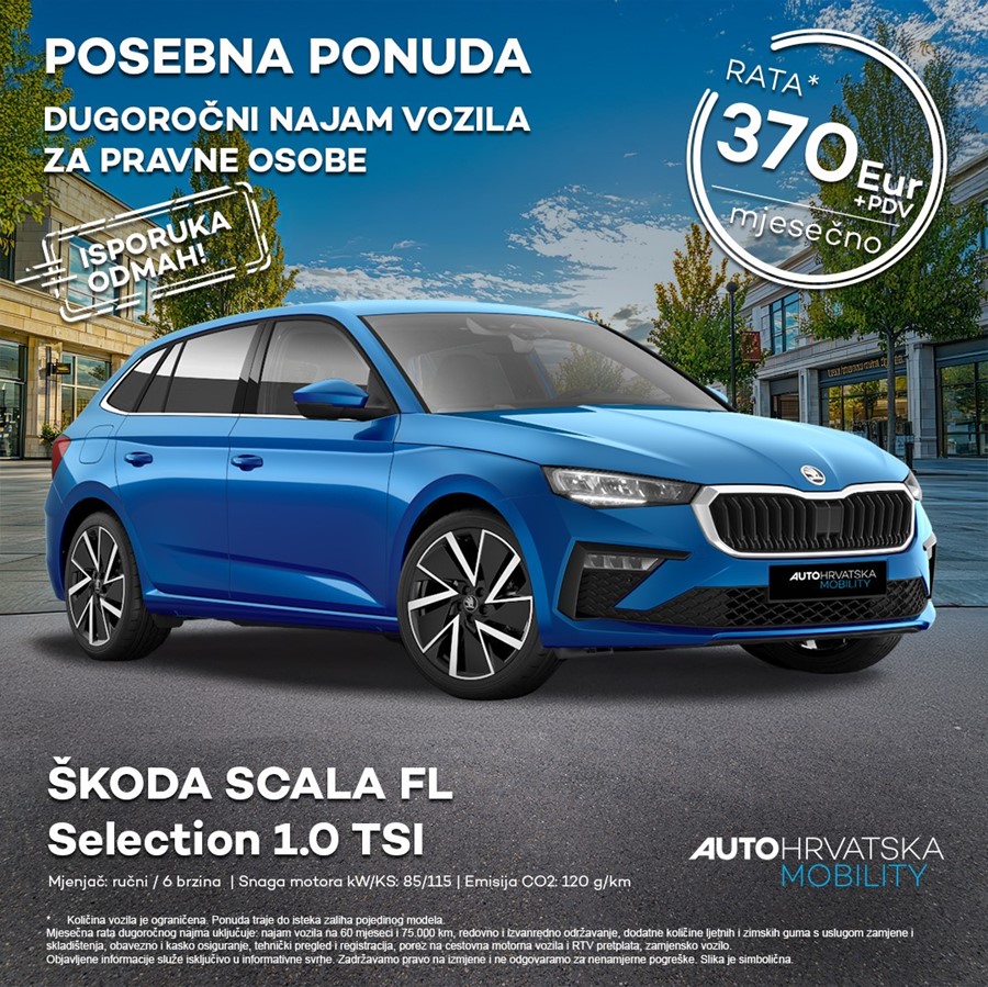 ▶️Škoda Scala dostupan je za dugoročni najam vozila po mjesečnoj rati od 370 €+pdv.